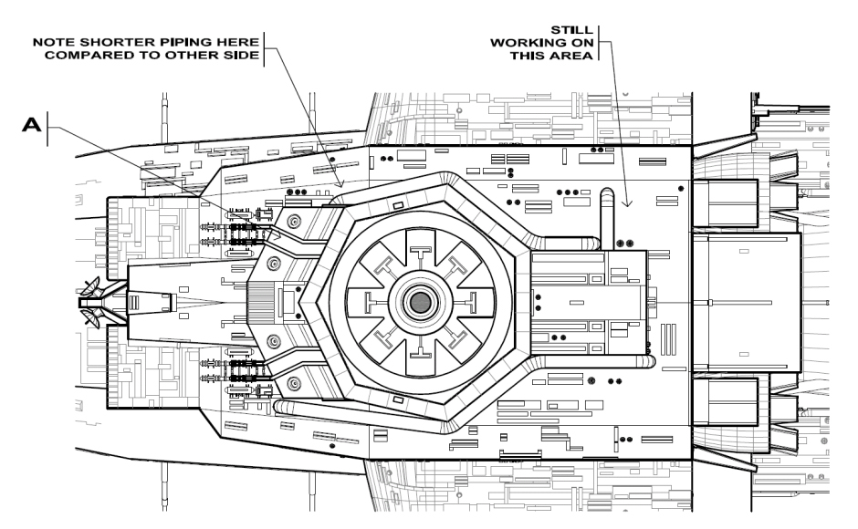 JTP, here's the part of the Nostromo docking module you emailed me about. There aren't many detailed photos of this area but what's clear is that the Halcyon kit isn't quite correct here at the part labeled 'A'...