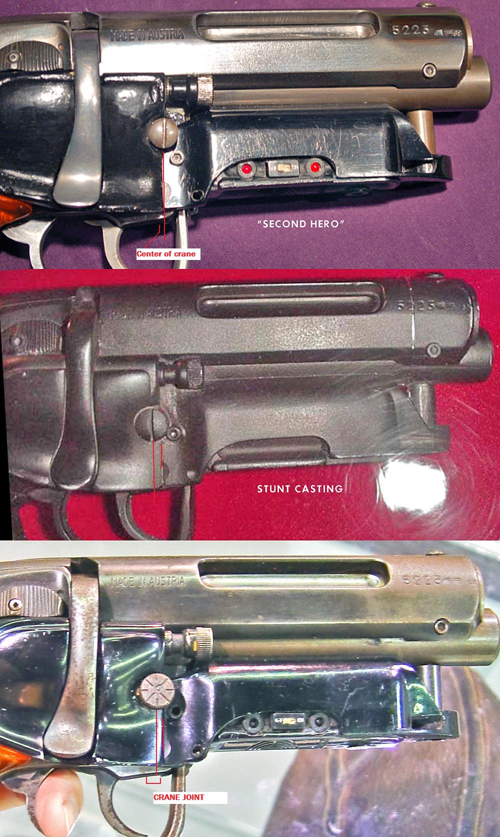 You can see that in both the stunt and the hero the screw/knob position is set behind the edge of the cover plate just about half the width of the crane arm on the other side of the gun. Both pictures are slightly tilted forward and back but you can still see the difference. In the pictures of Hero shown for the auction and the ones taken by Tomenosuke at the preview show a tapped hole going through and into the crane in that same spot. In the "second hero" pics it is lined up with the edge of the plate and too far forward to go into the crane arm. Doc3D speculated on this when he created his working version of the gun, but instead went with grinding in a catch in the front of his reciever to hold the cylinder release pin that he had cut down. The same way that Craig Kovach had done on his version of the fully functional gun. They did that to keep the cylinder locked in place when the force of the rounds gasses vented out around the cylinder. Without it the gun would fly open every time you shot it since the front of the cylinder pin is cut down and can no longer hold it in place. That is why Rich Coyle's first guns needed to have the Steyr ammo housing removed to load the gun, because he kept the pin intact. It is also why I know believe the weaver knob was an addition after filming, because it is not long enough to hold the crane, while a screw from a scope mount would be the perfect length.
