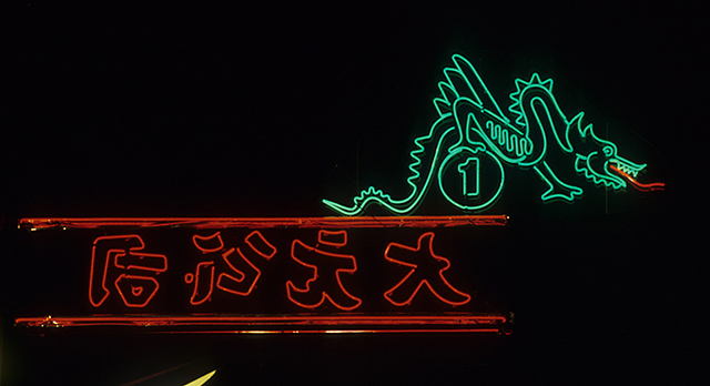 There IS a green dragon neon sign in Blade Runner. Somewhere. The EEG guys photographed a lot of the neon and cut up the transparencies to use on the miniatures. (They made little light boxes and glued the transparencies to the front.)
