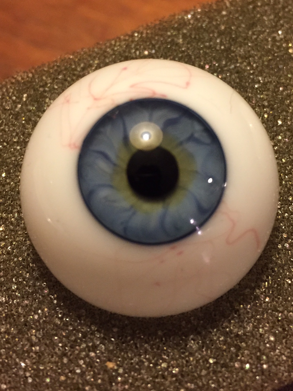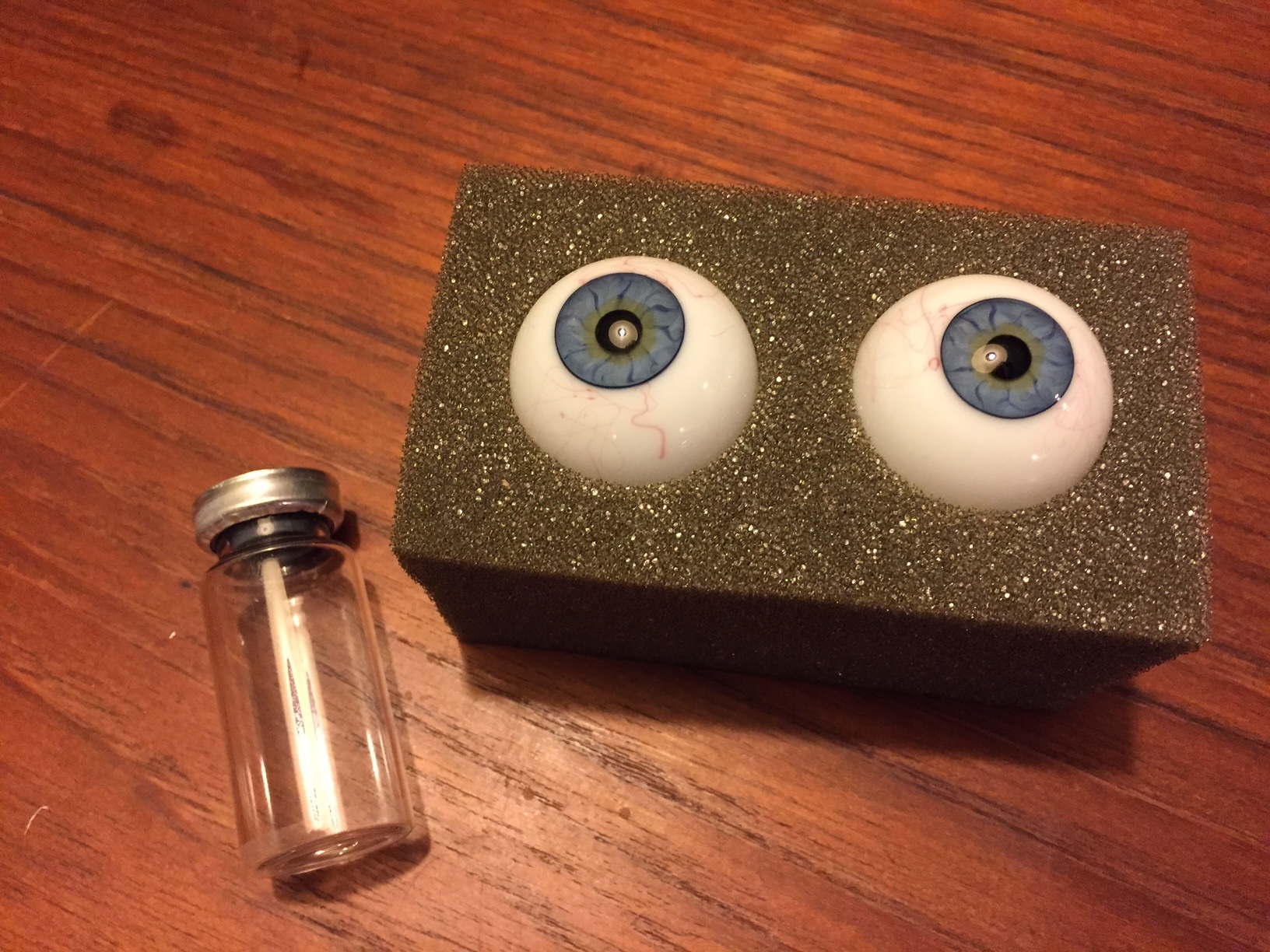 The new eyes came in today... They have the right size and shape equivalent to a grown adult. Quite optimistic about this part of the project after a longer period of dissatisfaction. Also got the glass vial that goes in the container.... The clear acrylic stand I had costum made in the UK and it shopped today. Is very excited to see it!